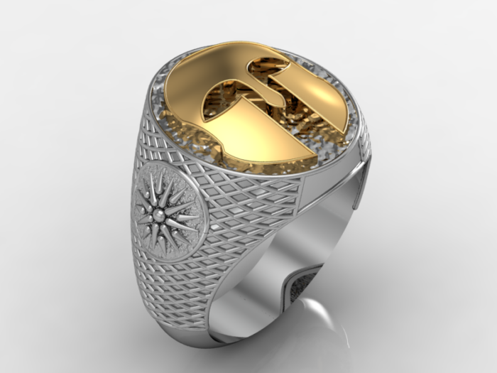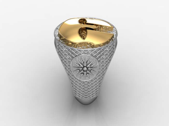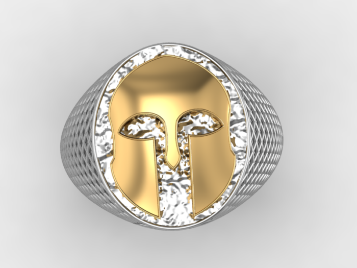 Αντρικό δαχτυλίδι φτιαγμένο από ασήμι με χρυσή περικεφαλαία στο πάνω μέρος.