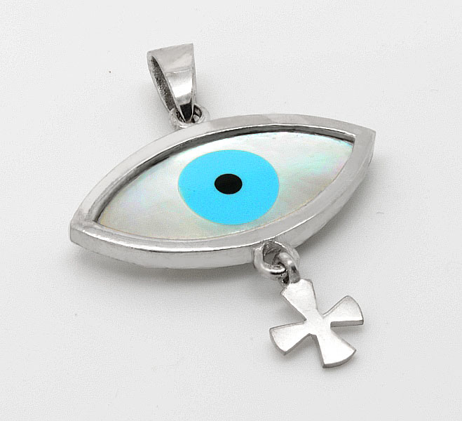 Μάτι με σταυρουδάκι κρεμαστό απο φίλντισι σε λευκό χρώμα